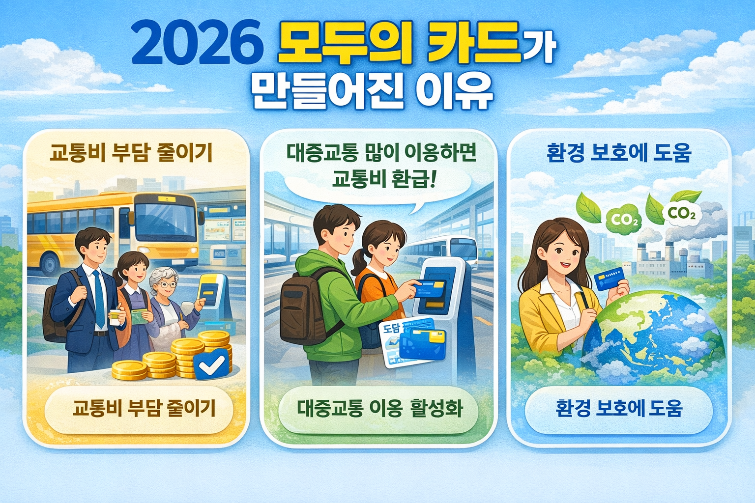 교통비는 반복되는 고정 지출입니다. 2026 모두의 카드를 활용하면 연간 기준으로 상당한 절감 효과를 기대할 수 있으며, 자가용 유지비 대비 부담 완화 효과도 있습니다.