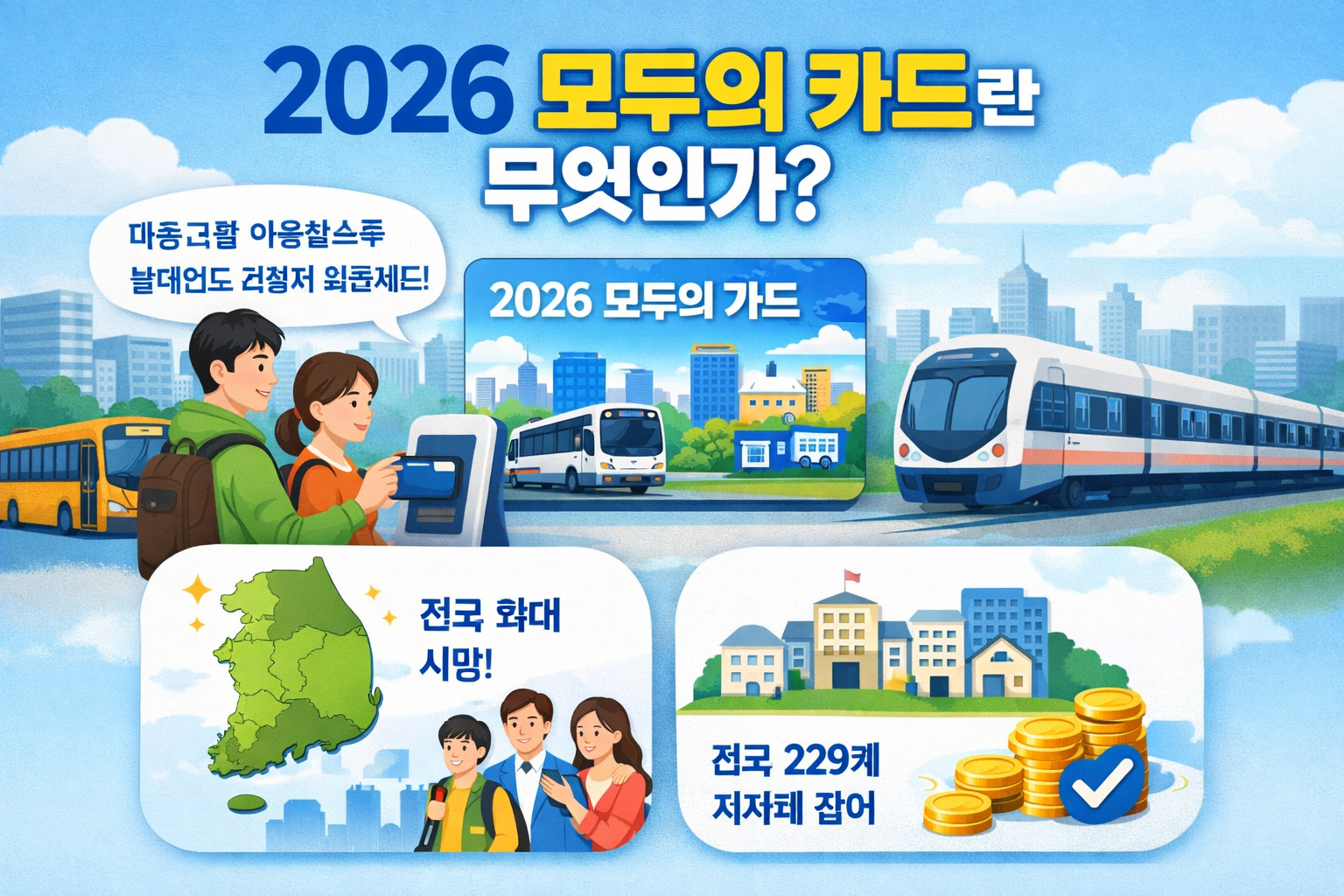 2026 모두의 카드는 전국 모든 지방정부가 참여하면서 사실상 전 국민을 대상으로 시행되는 대중교통 환급 제도입니다. 그동안 일부 지역에서는 예산 문제로 참여하지 못해 혜택을 받지 못한 주민들이 있었지만, 2026년 2월 4일부터는 거주 지역과 관계없이 누구나 동일한 조건으로 신청이 가능해졌습니다. 2026 모두의 카드에 대한 더 자세한 정보를 원하신다면 아래 썸네일이나 버튼을 클릭하세요!