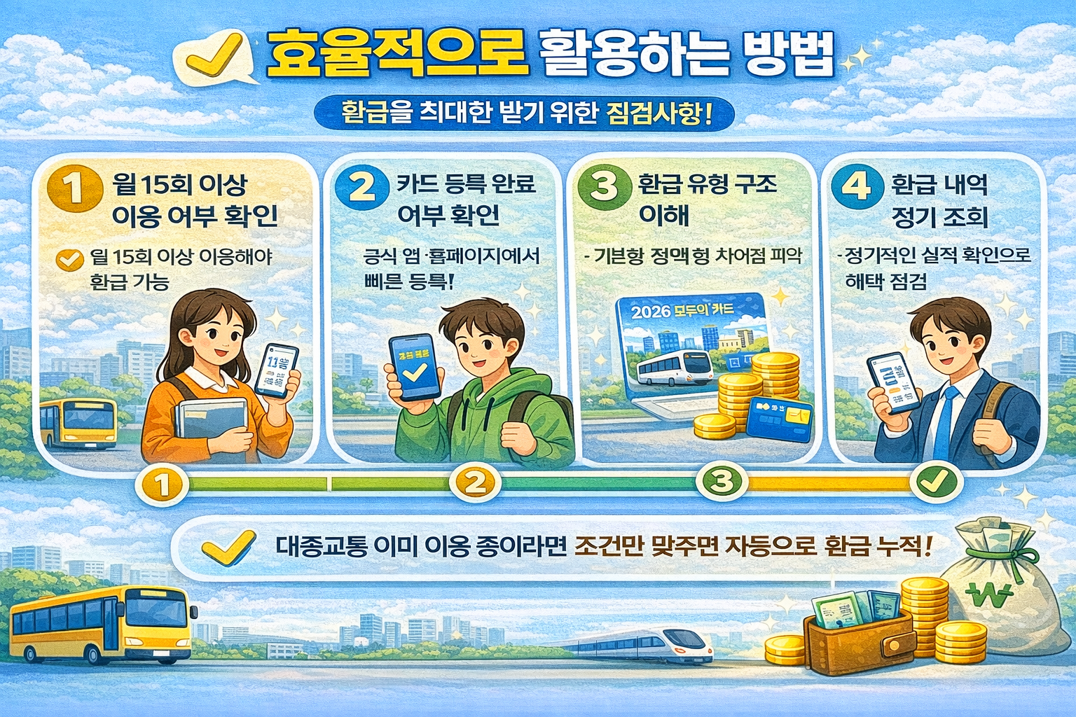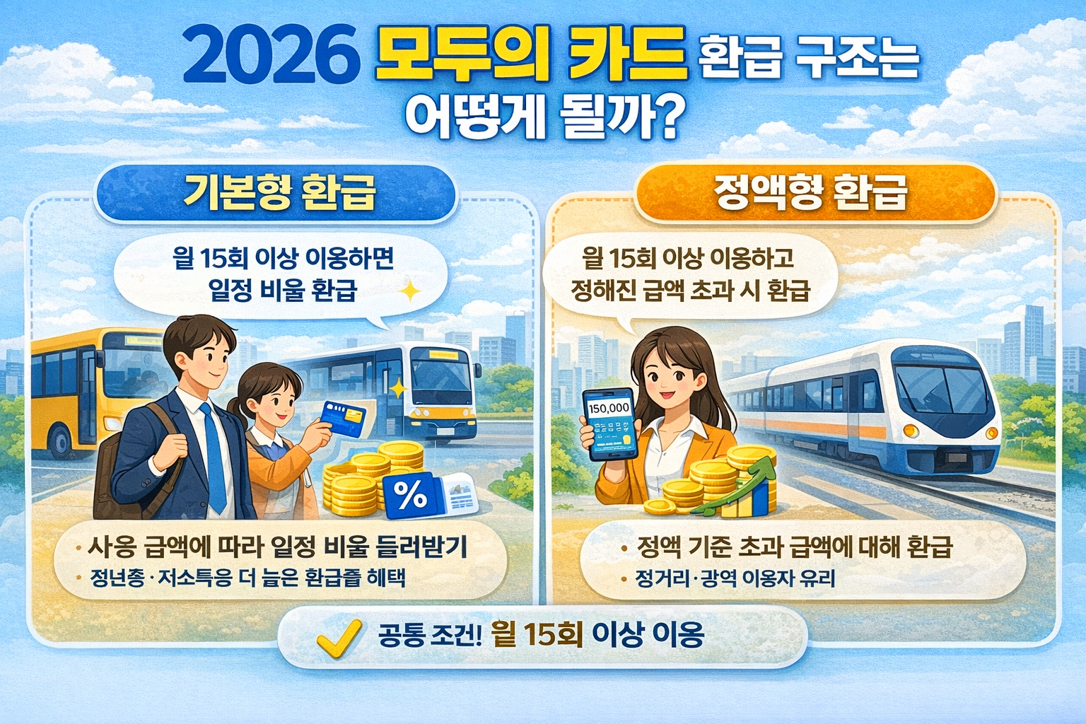 2026 모두의 카드는 월 15회 이상 대중교통 이용이라는 공통 조건을 충족해야 환급 대상이 됩니다.