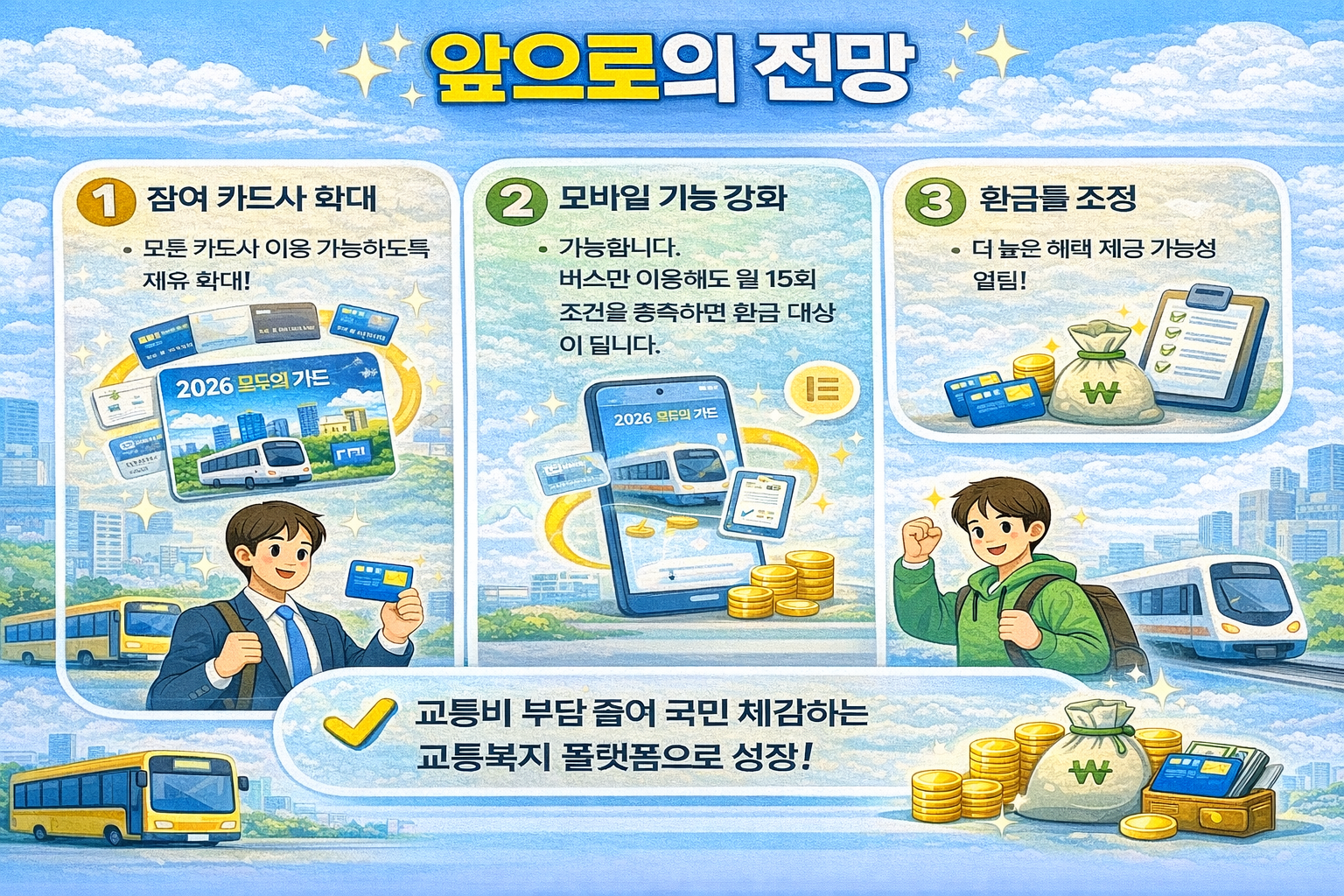 정부는 2026 모두의 카드를 장기 교통복지 정책으로 운영할 계획을 밝히고 있습니다. 향후 환급률 조정, 참여 카드사 확대, 추가 인센티브 도입 등이 논의될 가능성이 있으며, 데이터 기반 맞춤형 서비스로 발전할 여지도 있습니다. 2026 모두의 카드는 일회성 이벤트가 아니라 지속 운영을 전제로 한 구조라는 점에서 의미가 큽니다.