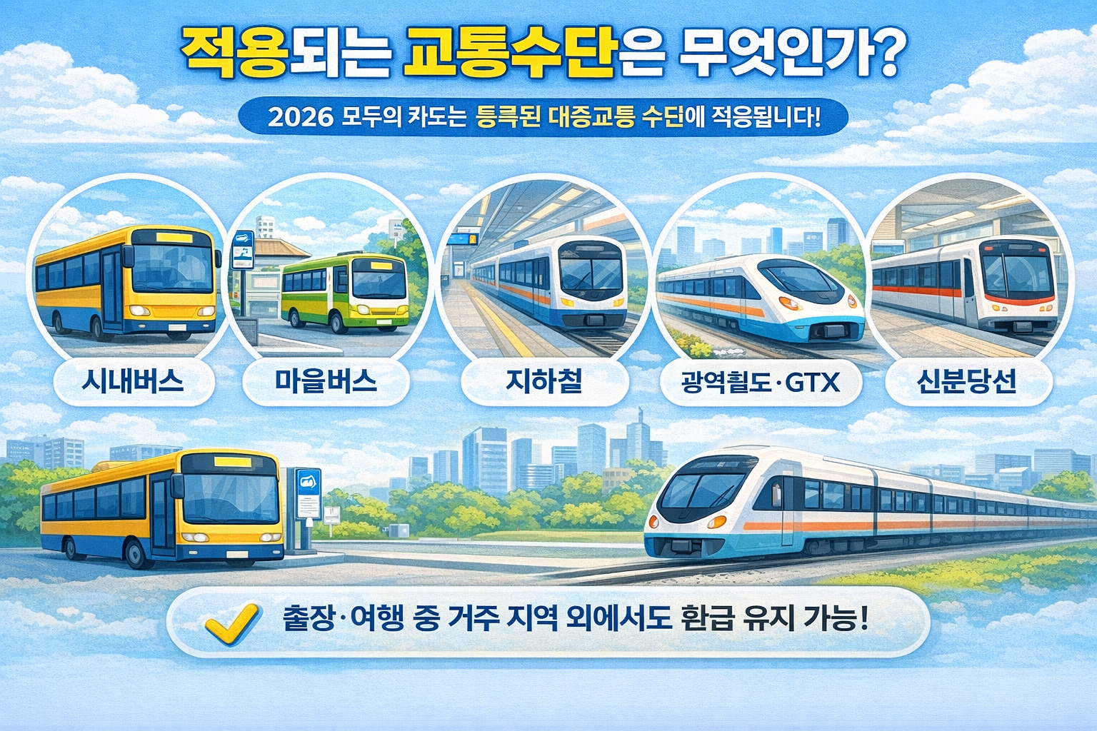 2026 모두의 카드는 시내버스, 마을버스, 지하철, 신분당선, GTX 등 광역철도에 적용됩니다. 지역 간 이동 시에도 환급 조건은 유지됩니다.