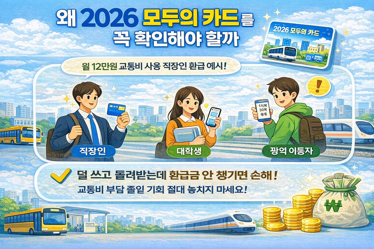 과거에는 수도권 중심 정책이라는 인식이 있었지만, 2026 모두의 카드는 전국 단위로 확대되면서 지방 거주자도 동일 조건으로 환급을 받을 수 있게 되었습니다. 특히 광역버스·광역철도 이용 비중이 높은 지역의 경우 체감 환급 효과가 큽니다. 출장이나 타 지역 방문 시에도 환급이 유지된다는 점 역시 2026 모두의 카드의 강점입니다.