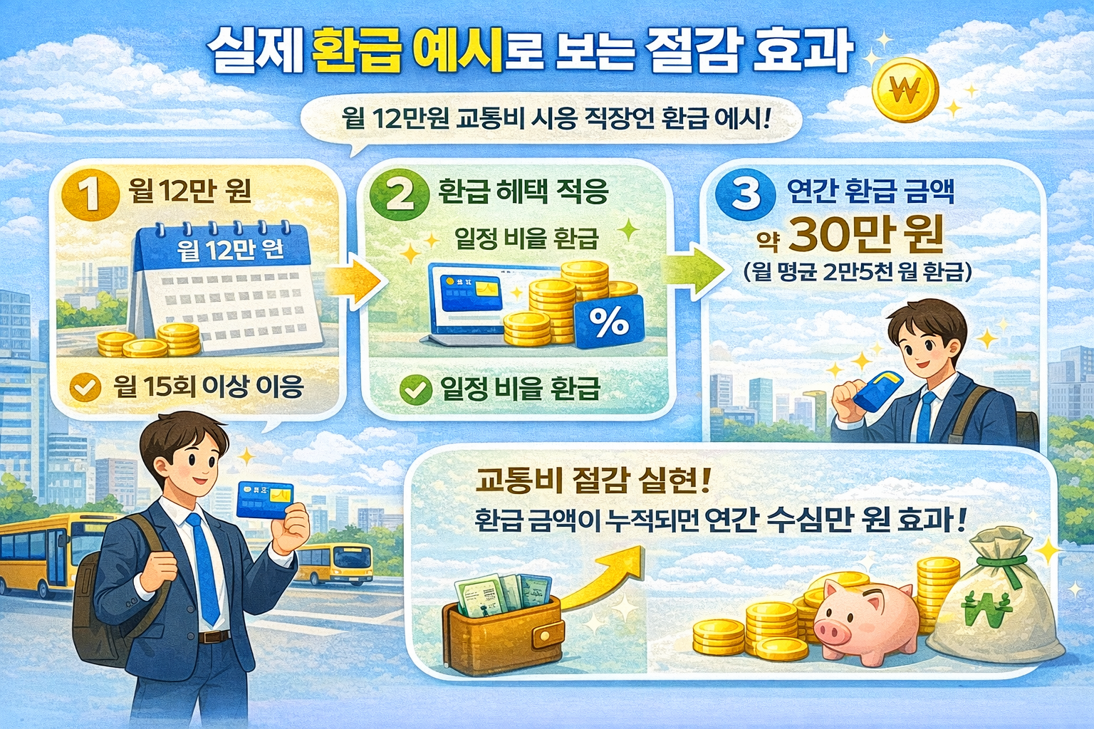 월 교통비 12만 원을 사용하는 직장인의 경우, 2026 모두의 카드 기본형 환급을 적용하면 일정 비율에 따라 수만 원 수준의 환급이 가능합니다. 정액형 구조에서는 기준 초과 구간에 대해 추가 환급이 적용됩니다.