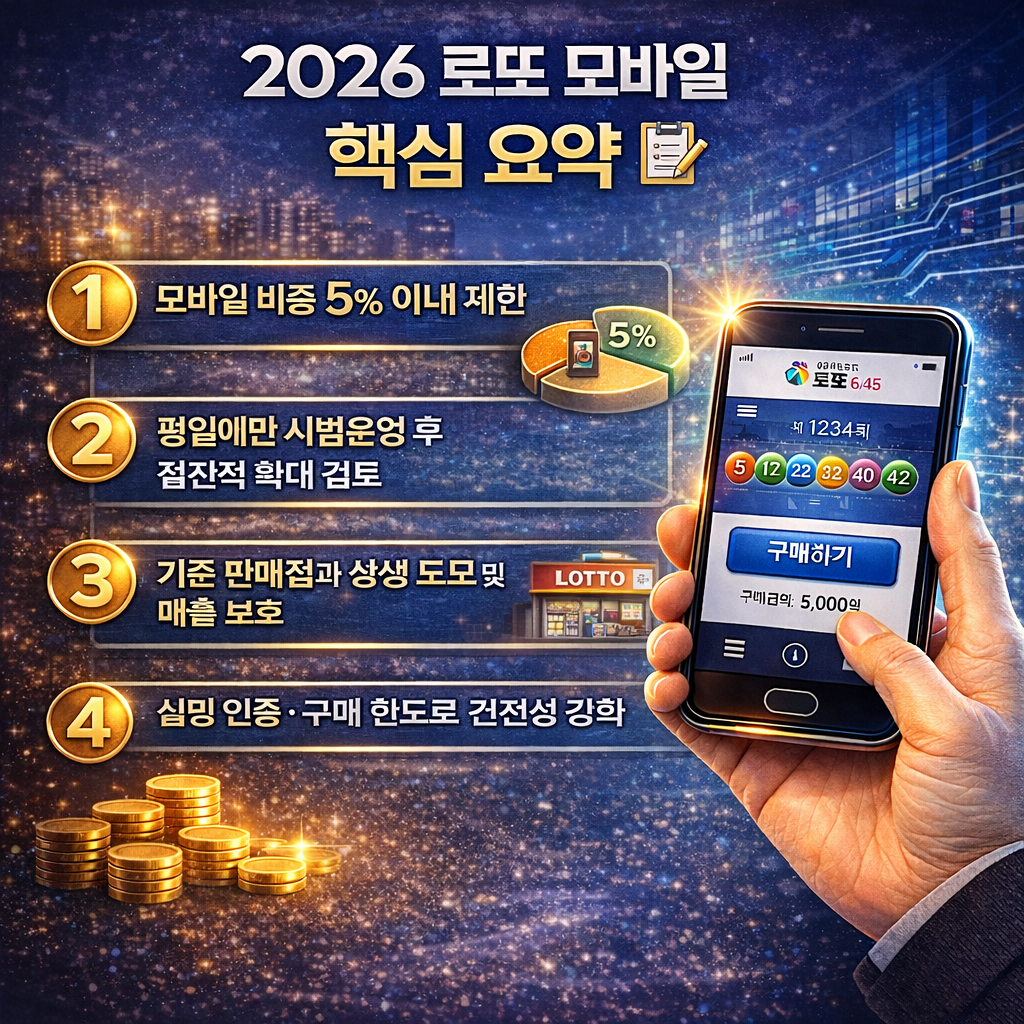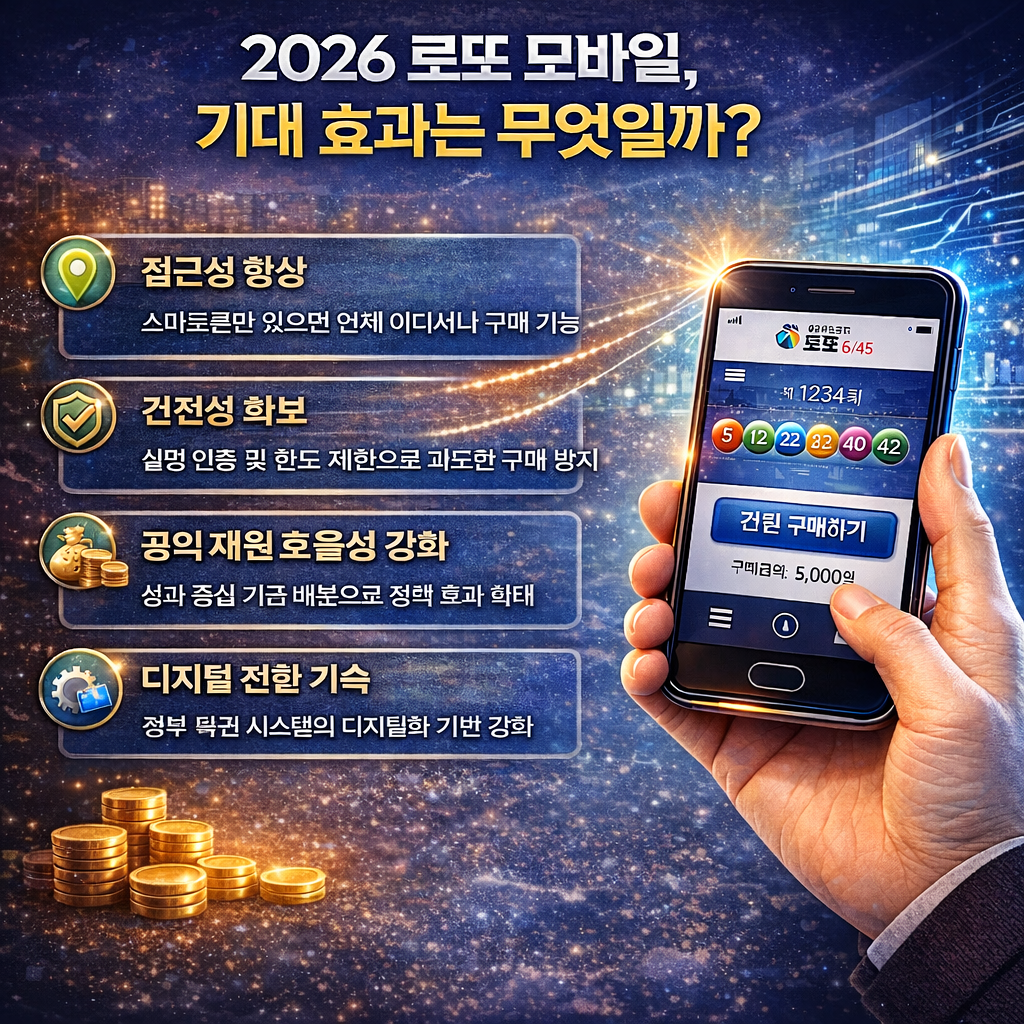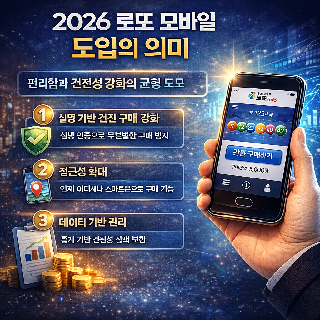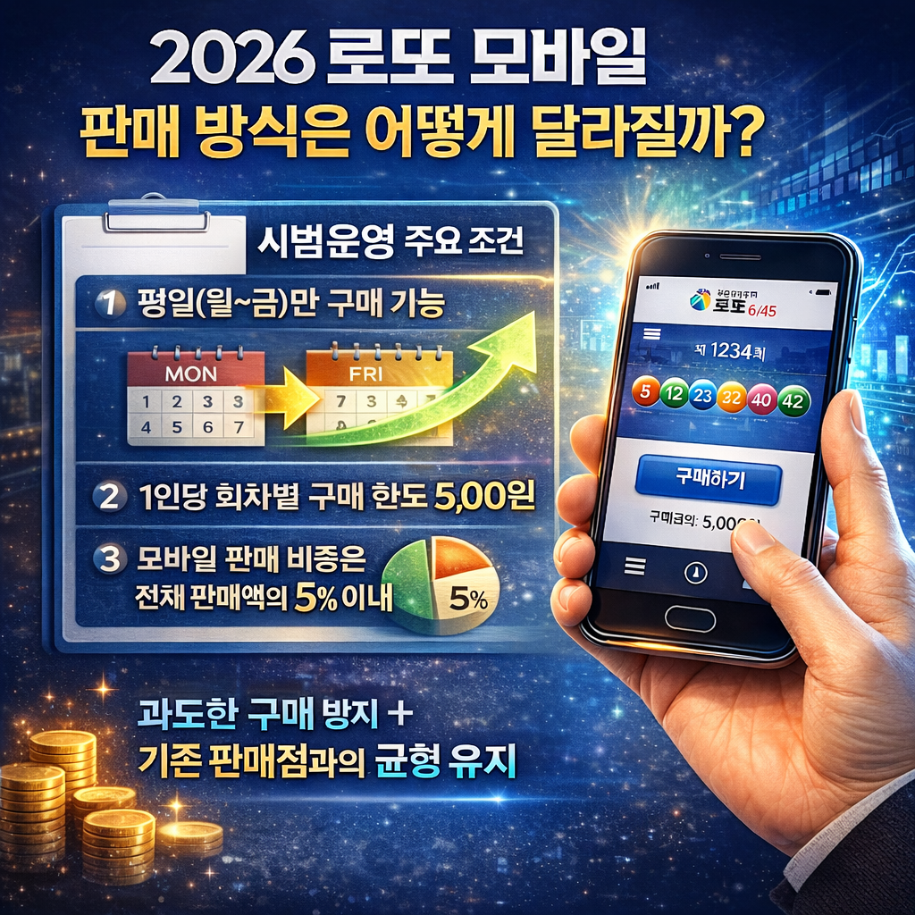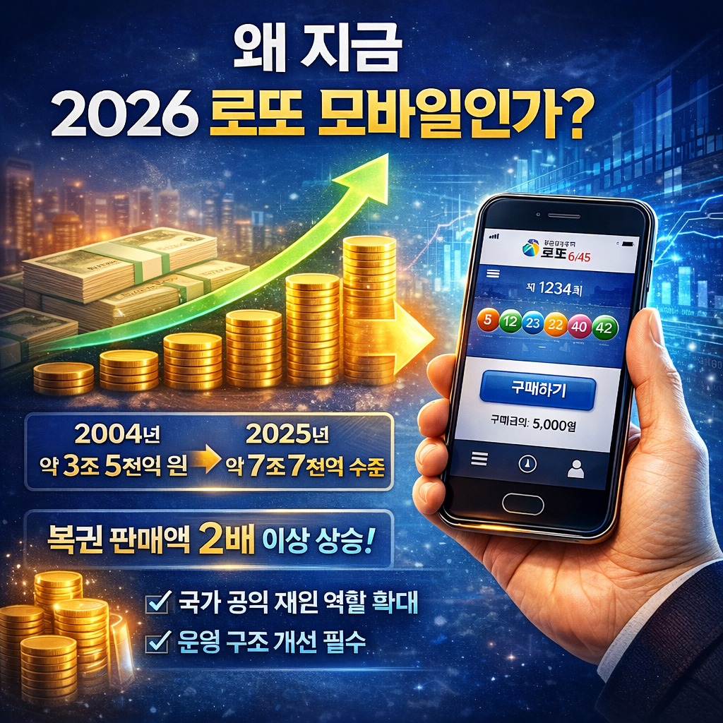 2026 로또 모바일 정책은 20년 만에 추진되는 복권제도 개편의 핵심 변화입니다. 모바일 구매 시범 도입, 판매 한도 설정, 복권기금 성과 중심 배분 전환 등 주요 내용을 정리했습니다. 2026 로또 모바일의 운영 방식과 향후 전망, 공익 재원 활용 변화까지 한눈에 확인해 보세요. 2026 로또 모바일에 대한 더 자세한 정보를 원하신다면 아래 썸네일이나 버튼을 클릭하세요!