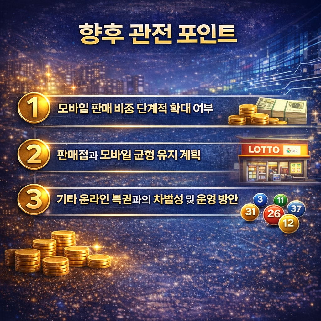 시범 운영 결과에 따라 판매 비중이 확대될 가능성은 열려 있지만, 당장은 안정적인 전환에 초점을 두고 있습니다. 로또 모바일의 성공 여부는 온·오프라인 균형 유지에 달려 있다고 볼 수 있습니다.